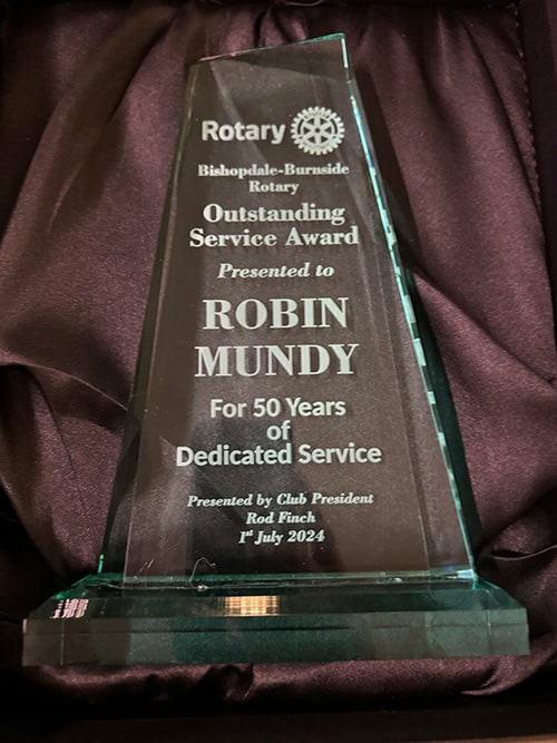 At the changeover, the Club presented Robin with an Outstanding Service Award for 50 years of dedicated service to Rotary and the Community.